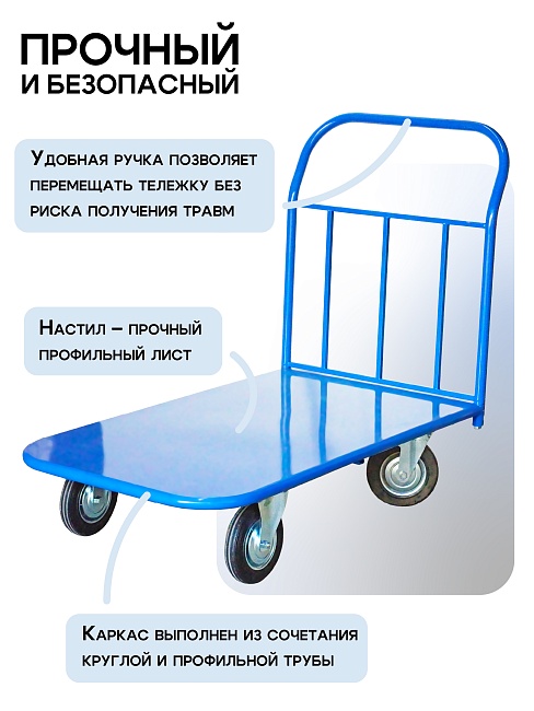 Платформенная тележка П-8.14 с колесами 250 мм используется для транспортировки товаров и грузов массой до 550 кг.