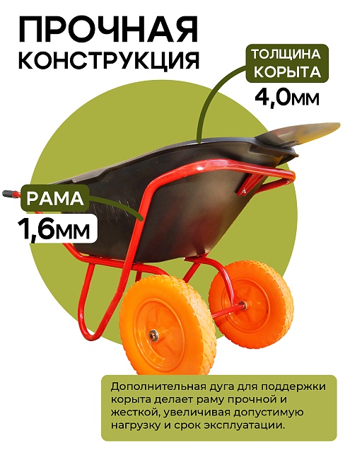 Тачка собирается на литых колесах из полимера ЭВА (этиленвинилацетат) с повышенной износостойкостью и сопротивлением повреждениям. Легко передвигается по уплотненному грунту или дороге.