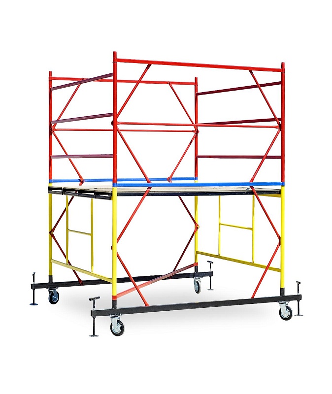 Узел крепления колес усовершенствован и выдерживает большие нагрузки. Стабилизаторы колес позволяют выровнять высоту и обеспечить устойчивость вышки